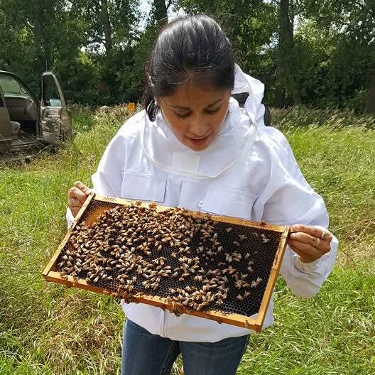 The honeybee’s summer lifecycle is roughly 45 days. This short existence means bees start working, cleaning the waste out of the cell they came from, as soon as they’re out of the cell. By day 5 they’re responsible for feeding younger bees. Around the 2-week mark they’re sourcing food, producing wax, making cells and cleaning the hive as needed. By the time they’re three weeks old, bees are on guard duty, protecting the hive from intruders such as skunks, badgers or beekeepers. This summer Marcella has been beekeeping with an injured leg, making her slow and clumsy. She’s gotten stung three times by these guard bees who are rightfully protecting the honey they and their sisters work so hard to produce.